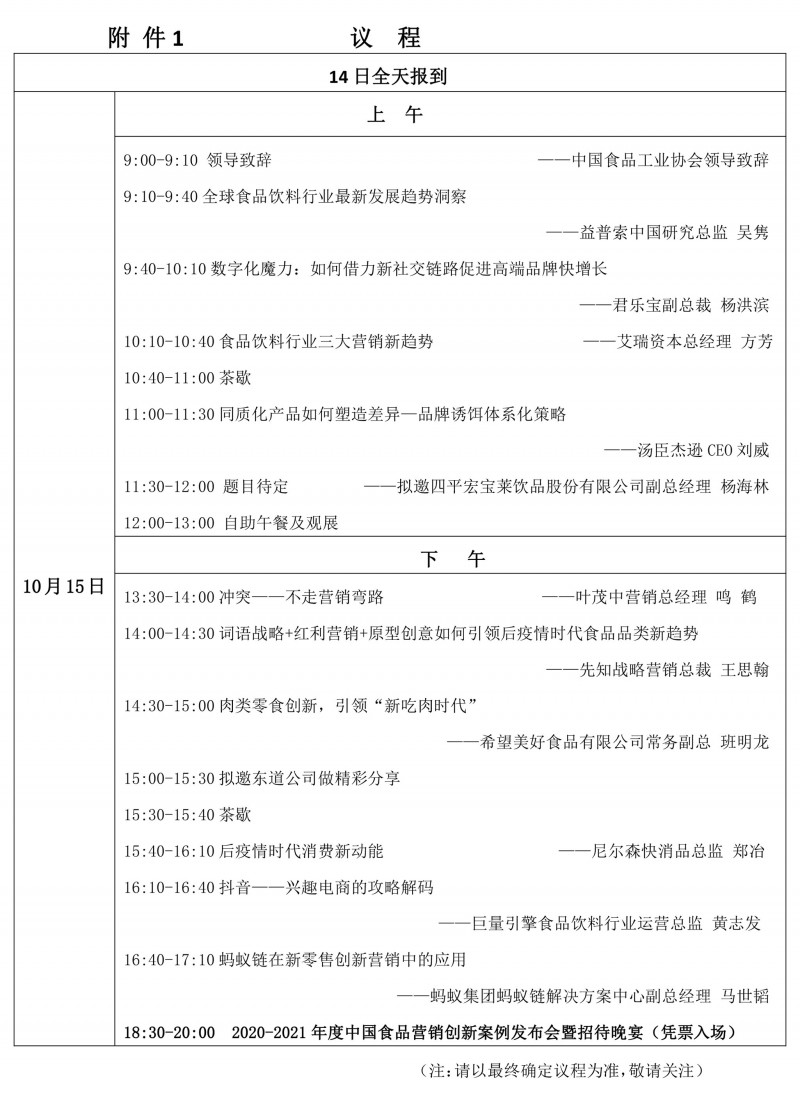 针对以上问题,由中国食品工业协会支持,中国食品工业协会经销商工作委员会主办的 2021 指南针大荟暨 CNFIA 食品饮料营销创新大会将于 2021 年 8 月19 日-20 日在北京举办。活动将邀请业内的营销实战大咖,从不同维度,深度对新形势下食品饮料行业营销新风向及未来发展趋势进行探讨和分享。活动的初心是希望通过营销创新大会平台,让企业的创新产品找准发力点,确立可持续的营销策略,提高行业整体的创新意识和营销管理水平。
