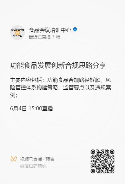 主办单位:食品伙伴网 6月4日15:00-16:00,免费直播【功能食品发展创新合规思路分享】,主要内容包括:功能食品合规路径拆解、风险管控体系构建策略、监管要点以及违规案例。