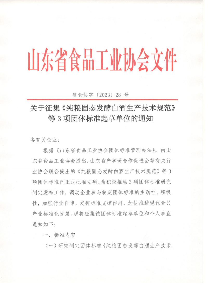 山东省食品工业协会关于征集《纯粮固态发酵白酒生产技术规范》等3项团体标准起草单位的通知(鲁食协字[2023]28号)