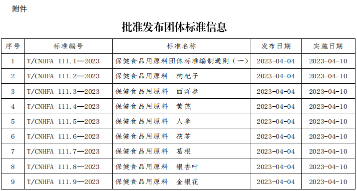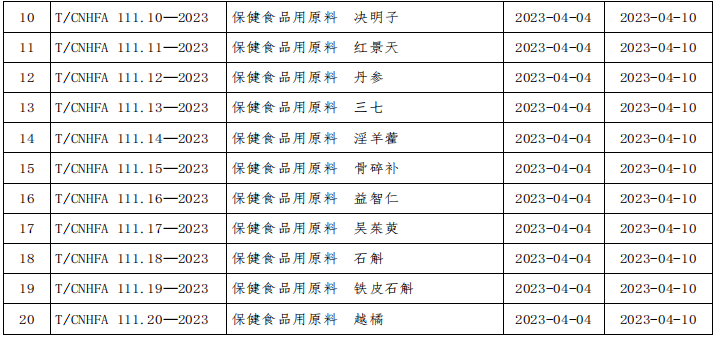 中国营养保健食品协会批准发布《保健食品用原料团体标准编制通则(一)》(T/CNHFA 111.1-2023)等20项团体标准,现予公告,自2023年4月10日起实施。