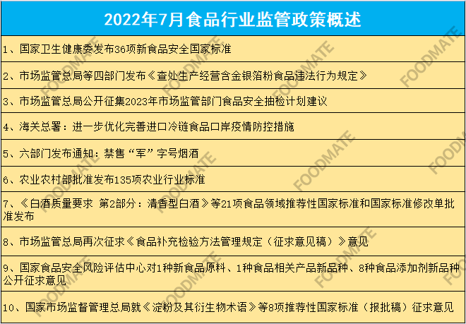 食品伙伴网讯 2022年7月,国家市场监管总局、海关总署、农业农村部、国家食品安全风险评估中心等监管部门发布了一系列食品行业监管政策,食品伙伴网整理汇总如下: