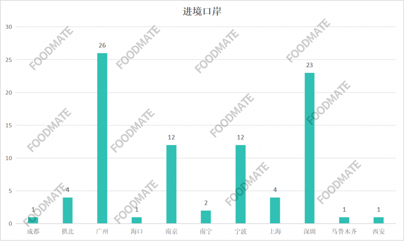 统计发现,2024年未准入境葡萄酒进境口岸涉及成都、拱北、广州、海口、南京、南宁、宁波、上海、深圳、乌鲁木齐、西安。其中,广州口岸未准入境葡萄酒数量最多,有26批次,其次,深圳口岸有23批次。