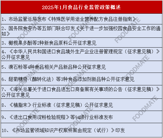 食品伙伴网讯 2025年1月,国家市场监管总局、国家卫生健康委员会、海关总署、国家食品安全风险评估中心等部门发布了一系列食品行业监管政策,食品伙伴网整理汇总如下: