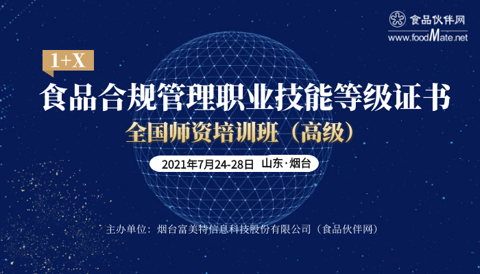为贯彻落实《国家职业教育改革实施方案》和《教育部等四部门关于在院校开展“学历证书+若干职业技能等级证书”制度试点方案》,高效有序推进食品合规管理职业技能等级证书实施工作,助力院校专业师资团队建设,烟台富美特信息科技股份有限公司(食品伙伴网)将于2021年7月24-28日举办1+X食品合规管理职业技能等级证书第二期全国师资培训班(高级)。现就有关事项通知如下: