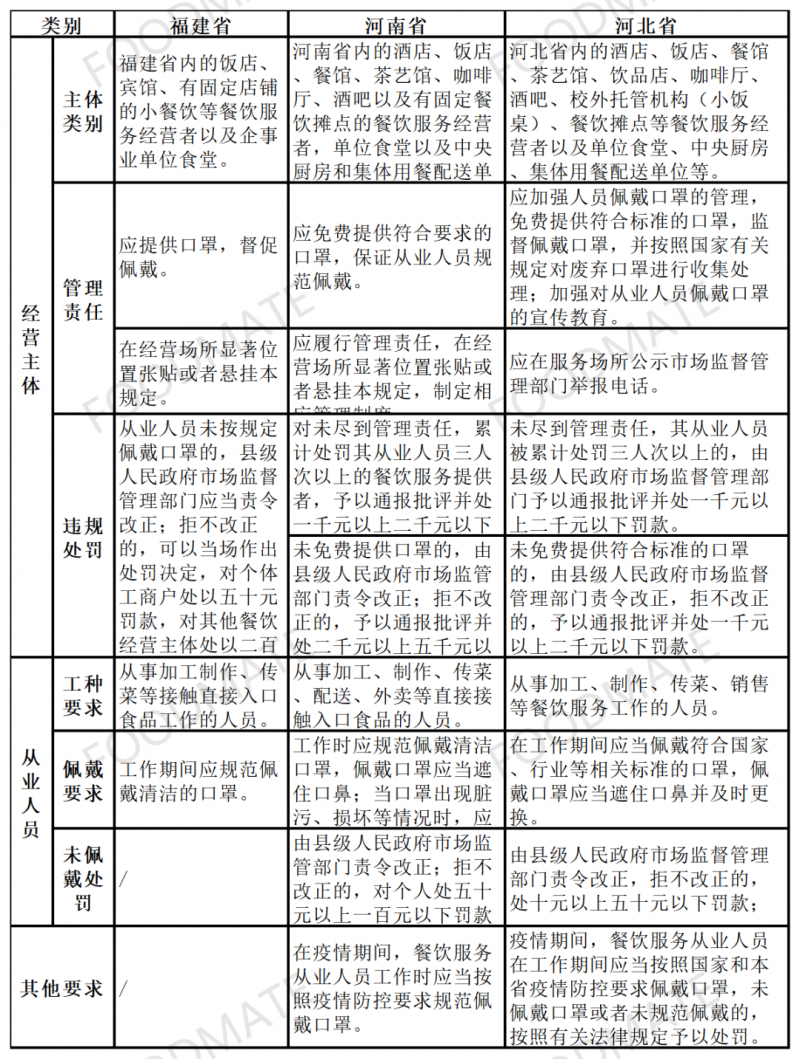2021年2月,福建省发布《福建省餐饮服务从业人员佩戴口罩的规定》;2022年4月,河南省公布《河南省餐饮服务从业人员佩戴口罩规定》;2022年5月,河北省公布《河北省餐饮服务从业人员佩戴口罩规定》。这三个地方规定主要对从业人员工种、口罩佩戴要求、经营主体的责任与义务、违规处罚等进行了具体要求,详细内容可见表1。