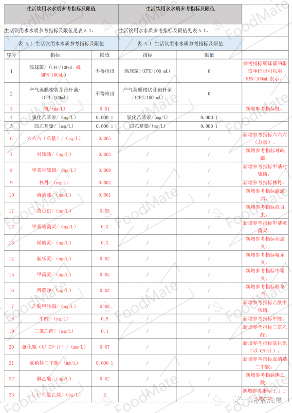 7月12日,国家卫生健康标准委员会环境健康标准专业委员会在全国标准信息公共服务平台对GB 5749《生活饮用水卫生标准》强制性国家标准(征求意见稿)征求意见,征求意见截止到2021年9月10日,本次修订内容包括指标分类方法由“常规指标和非常规指标”调整为“常规指标和扩展指标”、标准正文中的水质指标由106项调整到97项、附录A(资料性)水质参考指标由28项调整到55项、调整了8项指标的限值、调整了2项指标的名称、调整了11项指标的分类等,食品伙伴网为方便大家查看标准拟修订的具体内容变化,将《生活饮用水卫生标准(征求意见稿)》与GB 5749-2006进行了比对,供大家参考。