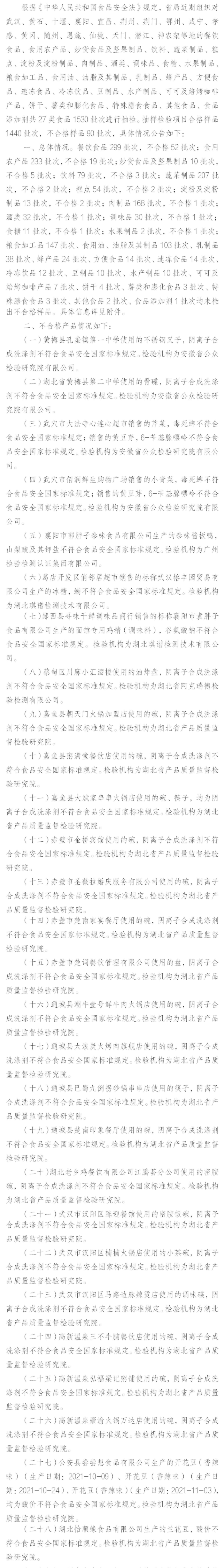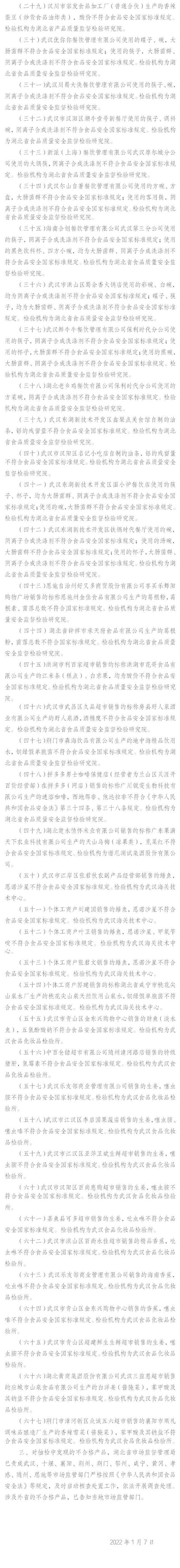 湖北省市场监督管理局 食品安全监督抽检信息公告(2022年第1期)
