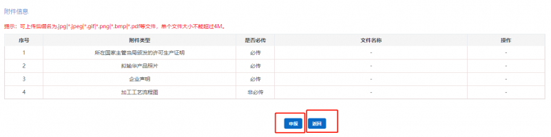 第七步:按系统要求完成“企业基本信息”、“生产相关信息”的填写和相关文件的上传,“企业声明”的填写、扫描机上传,以及“附件信息”的确认。所有信息确认完整无误后,点击“申报”,产品注册完成。