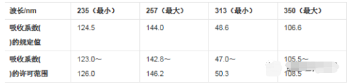 取在120℃干燥至恒重的基准重铬酸钾约60mg,精密称定,用0.005mol/L硫酸溶液溶解并稀释至1000ml,在规定的波长处测定并计算其吸收系数,并与规定的吸收系数比较: