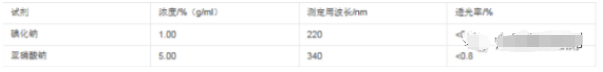杂散光的检查:可按下表所列的试剂和浓度,配制成水溶液,置1cm石英吸收池中,在规定的波长处测定透光率,应符合表中的规定。