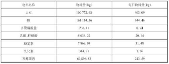 表4 年产2000t大豆发酵饮料所需原料、辅料量