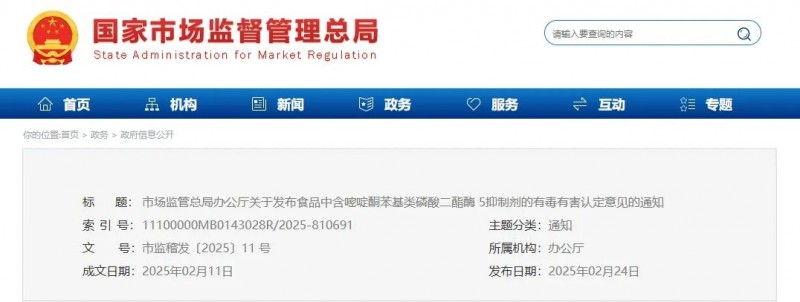 市场监管总局办公厅关于发布食品中含嘧啶酮苯基类磷酸二酯酶 5抑制剂的有毒有害认定意见的通知