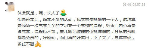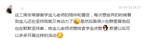 在活动期间,“一起学”打卡群内学习氛围浓厚。大家遇到学习问题都会在群内提出,学友们一起讨论解决。每天完成当日的课程测试后,学员们也会把自己的成绩发送到群内分享。当自己快坚持不下去的时候,发现大家都还在坚持,互相鼓励,瞬间又充满能量。在最后一天的结课班会上,学员们也纷纷表示自己在这次活动中的收获。