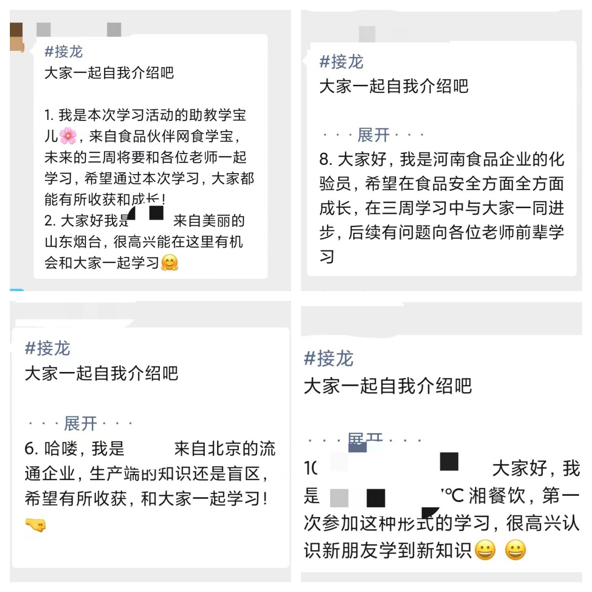 “一起学·食品生产现场质量控制”活动开始第一天,为了使学友之间更加熟络,为接下来的学习做好准备,特地安排出一天进行了班会。班会期间,在助教老师的带领下,来自全国各地的学员,在同一个学习群中自我介绍,表达自己参加活动的初衷,以及希望获得的收获,互相认识,互相鼓励,气氛活跃,对接下来三周的学习充满了期待。