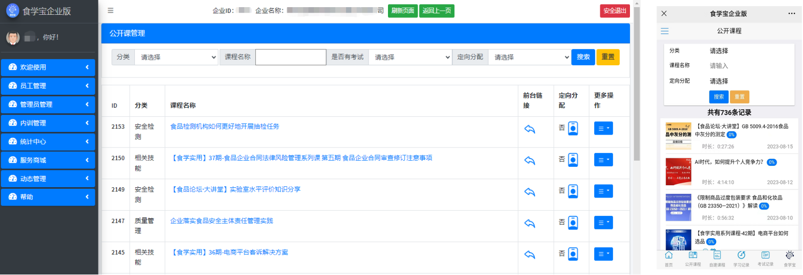 食学宝企业版是食学宝面向食品企业开发的内训培训平台,为企业提供在线学习和培训管理服务。平台汇聚食学宝几百门食品课程资源,同时系统支持课程自建上传,考试阅卷、员工管理、学习统计、动态通知等功能,帮助企业建立培训体系,管理员工培训。