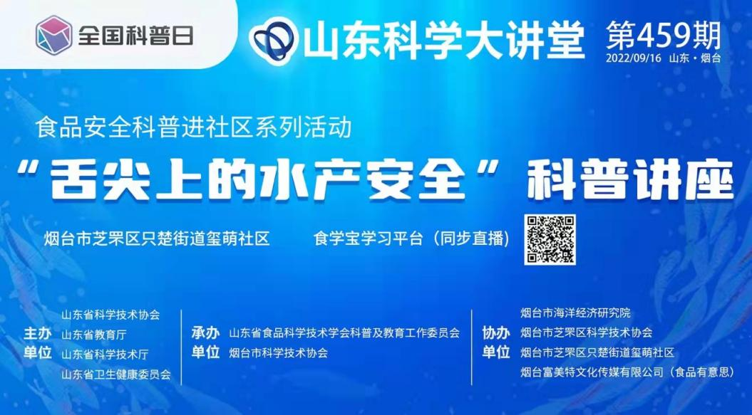 由山东省科学技术协会、山东省教育厅、山东省科学技术厅、山东省卫生健康委员会主办、山东省食品科学技术学会科普及教育工作委员会、烟台市科学技术协会承办,烟台市海洋经济研究院、烟台市芝罘区科学技术协会、烟台市芝罘区只楚路玺萌社区、烟台富美特文化传媒有限公司(食品有意思科普动漫团队)协办的山东科学大讲堂(第459期)《食安进社区|“舌尖上的水产安全”科普讲座》于2022年9月19日在烟台市芝罘区只楚街道玺萌社区成功举办,食学宝在线学习平台服务团队奔赴现场,顺利完成现场直播。