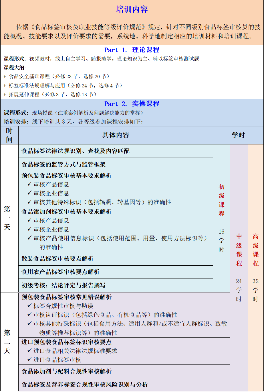 为帮助食品标签审核从业人员全面提高审核食品标签的规范性、合规性的能力,帮助企业有效规避投诉举报的发生,切实提升企业食品标签合规管理能力,食品伙伴网根据《规范》规定,组织标签审核从业人员进行相应等级技能培训和技能水平评价,具体培训及考核安排如下: