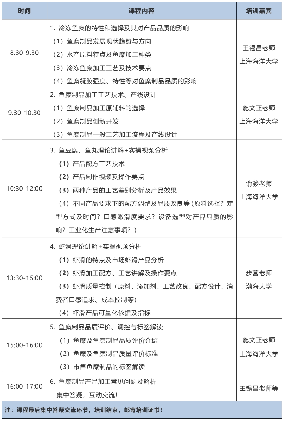 食品伙伴网根据目前疫情形式及广大学员对“鱼糜制品加工技术”的培训需求,现决定于12月16日推出线上培训课程。本次课程将从鱼糜制品的原料选择与特性、配方工艺技术、品质改良与质量调控、设备选择与产线设计、常见问题及分析等方面进行系统讲解和交流,以鱼糜制品种的3款典型爆品为案例,系统理论讲解+实操视频分析+直播答疑交流的形式,使培训学员不仅在产品创新开发中有所启发,工艺技术也能更好的应用到实际研发生产中。