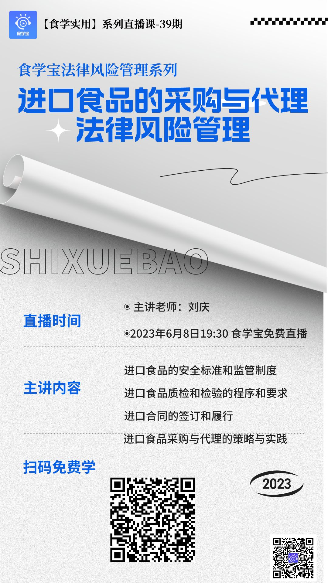 本次的课程由刘庆老师带来,刘庆老师将结合自己多年的食品科学管理及法治实践经验,带领大家从法律视角对进口食品的有关知识进行学习。