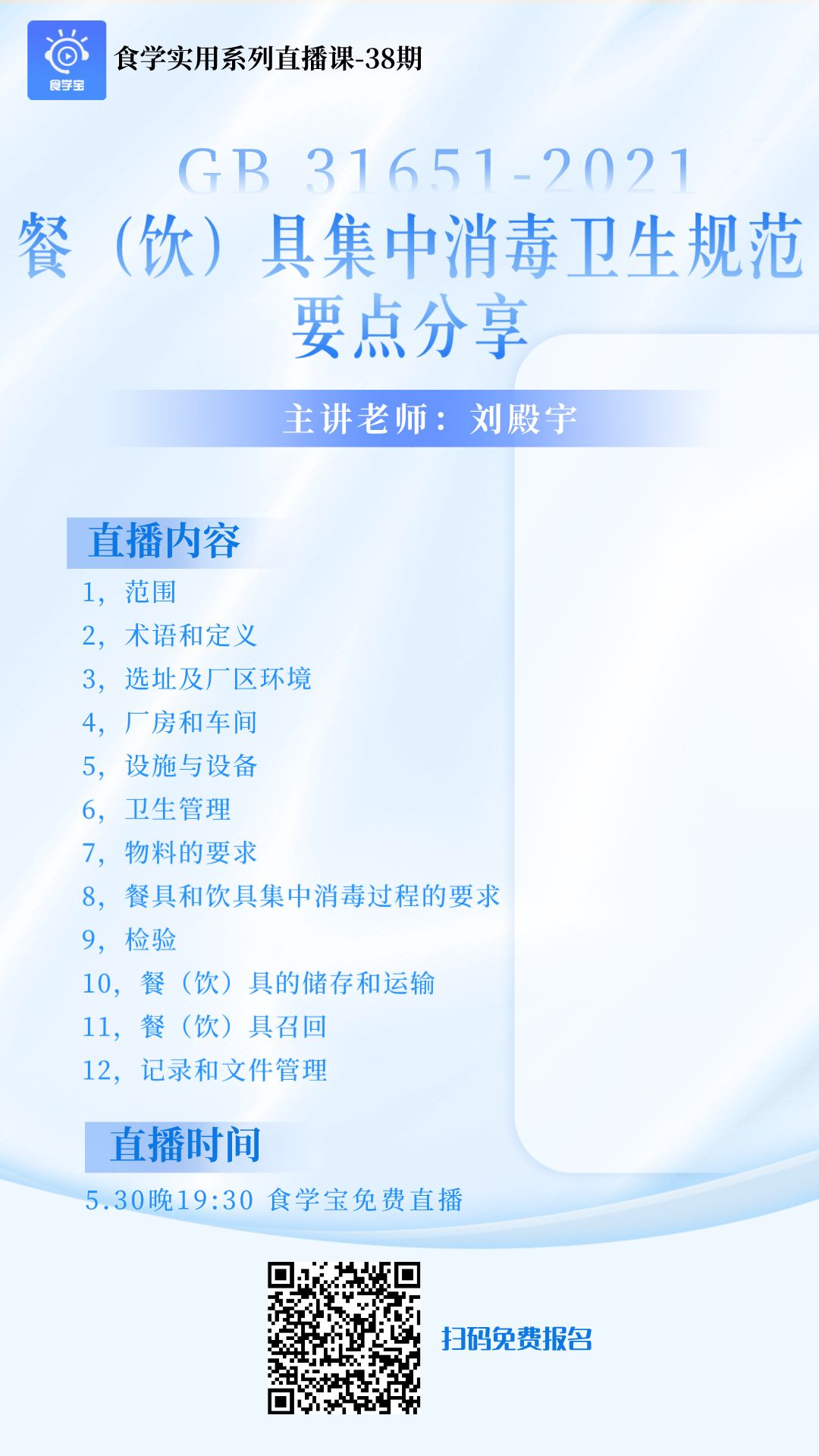 本次的课程由刘殿宇老师带来,刘殿宇老师将结合自己多年的食品安全管理实践经验,带领大家对《(GB 31651-2021)餐(饮)具集中消毒卫生规范》进行学习,让我们更加深入的了解餐饮具集中消毒的过程控制要素。