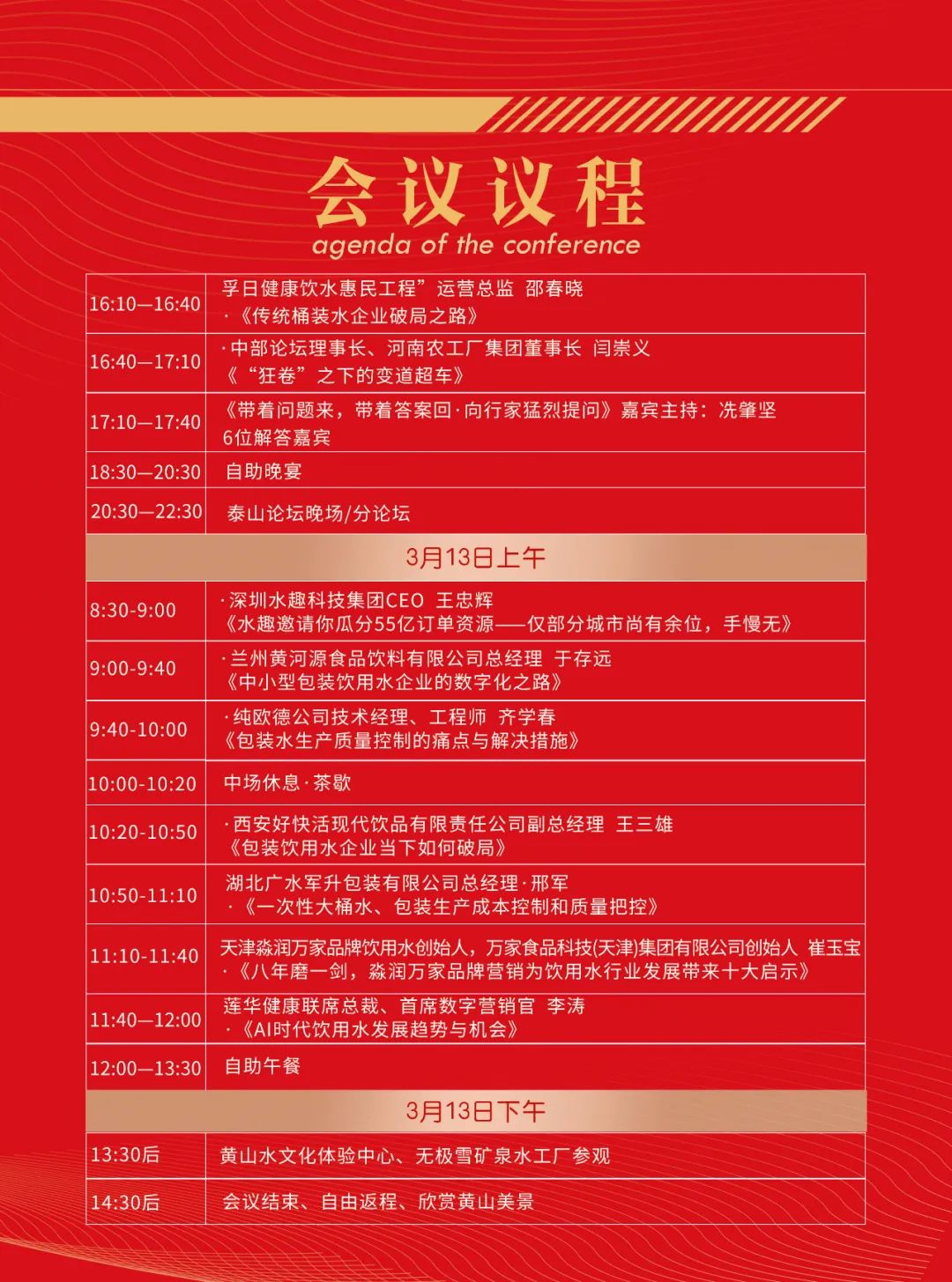 泰山论坛相约黄山,3月11日—13日,第十届饮水行业泰山论坛将在黄山举办。本次论坛的主旨是聚焦饮用水行业发展现状,促进行业交流,遵循行业健康饮水标准,推动行业技术创新,共同推进饮水行业高质量发展。本次论坛将会积极落实基础工作,针对大家关心的饮水行业当下发展热点问题,逐一解答,届时与会还有许多专家和行业内优秀嘉宾到场,饮水同仁们互相交流,学习,探讨进步,诚邀您参加。