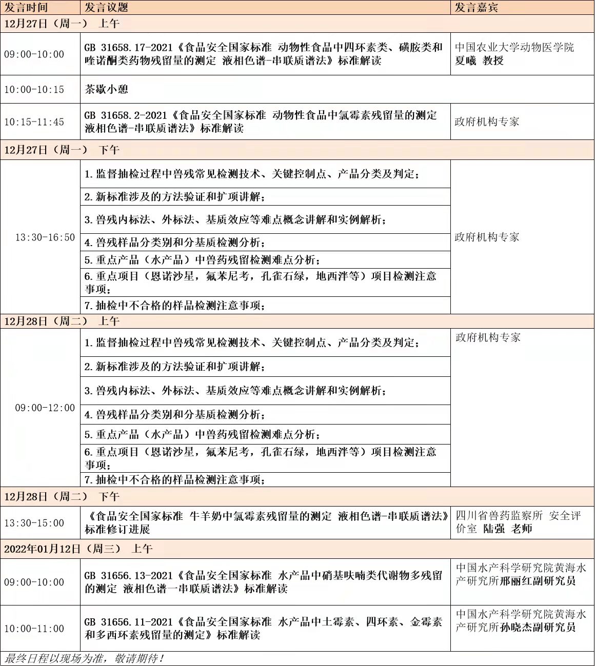 近日,农业农村部、国家卫生健康委员会、国家市场监督管理总局联合发布公告:根据《中华人民共和国食品安全法》规定,经食品安全国家标准审评委员会审查通过,现发布《食品安全国家标准 牛可食性组织中氨丙啉残留量的测定液相色谱-串联质谱法和高效液相色谱法》(GB31653.1-2021)等36项食品安全国家标准,自2022年2月1日起实施。为了帮助各相关管理部门、食品生产企业以及食品检验机构正确应用标准,提高检测技能,保障食品安全,食品伙伴网计划2021年12月27-28日于 线上 举办“新发布兽药残留检测食品安全国家标准解读培训班”。现将相关事宜预告如下: