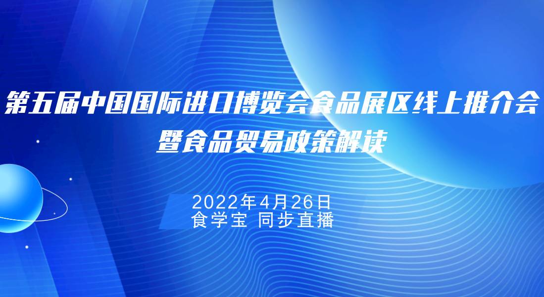 由中国国际进口博览局、中国报关协会、上海市报关协会主办,中国通关网、进博会展盟农产品专委会、食品伙伴网协办的第五届中国国际进口博览会食品展区线上推介会暨食品贸易政策解读将于2022年4月26日举办,食学宝在线学习平台进行同步直播。会议安排如下: