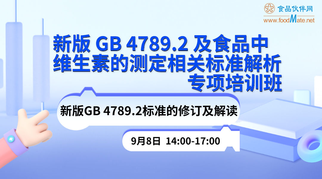 2022 年7月28日,国家卫生健康委、市场监管总局联合印发 2022 年第 3 号公告,发布 36 项新食 品安全国家标准和 3 项修改单。其中 GB 4789.2-2022《食品安全国家标准 食品微生物学检验 菌落总数 测定》以及 GB 5009.211-2022《食品安全国家标准 食品中叶酸的测定》和 GB5009.285-2022《食品安 全国家标准 食品中维生素 B12 的测定》都有较大的修订,因此,为了增强相关检验机构对食品安全新版 国家标准的理解,提高微生物学检验能力,保障食品安全,食品伙伴网主办的“新版 GB 4789.2 及食品 中维生素的测定相关标准解析专项培训班”将于 2022 年 9 月8 日进行线上直播。