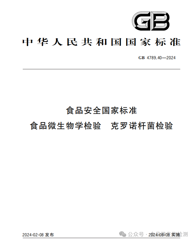 GB 4789.40-2024《食品安全国家标准 食品微生物学检验 克罗诺检验》为上述标准之一。标准于2024年2月8日发布,将于2024年8月8日正式实施。