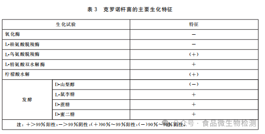 可以首先鉴定克罗诺杆菌显色培养基平板上最具特征性的菌落接种的TSA平板上的菌落。如果是阳性,则不需要测试其他TSA平板上的菌落。如果是阴性,则选取其他TSA平板上的菌落进行鉴定,直到全部为阴性或发现阳性菌落为止。为确保结果的准确性,对TSA平板上的菌落进行鉴定时,应使用新鲜的传代菌落。克罗诺杆菌的主要生化特征见表3。