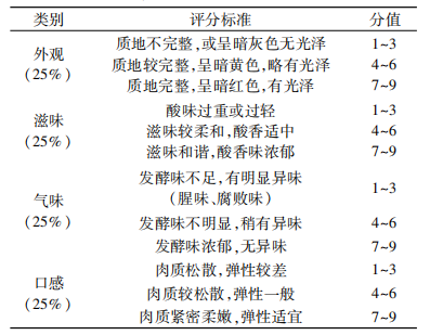 在酸鱼贮藏0.45和90 d期间对其外观﹑滋味﹑气味和口感进行感官评分分析,将酸鱼切成1 cm x 1 cm x 1 cm的小块,由挑选的12名(6男6女,年龄均在20~35岁之间)受过专业培训的感官评定人员组成的评定小组对样品的外观、滋味、气味和口感进行感官评定(总体可接受度为25%外观+25%滋味+25%气味+25%口感),评定标准见下表。