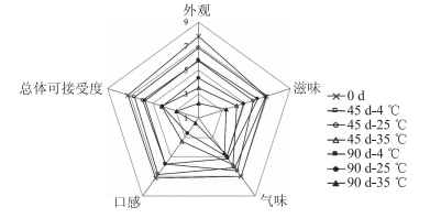 感官评分是发酵鱼贮藏期间重要的评价指标之一,直接影响消费者的接受性。酸鱼的感官评分结果如图1所示。由图可知 ,贮藏温度越高,时间越长,则酸鱼的感官评分越低。随着贮藏温度的升高,贮藏时间的增加,从鱼肉中迁移出来的水分越多,酸鱼的外观品质和口感越差。在4℃贮藏90 d后酸鱼的感官品质变化较小,酸香味和口感保持较好,总体可接受度相对较高。在25℃贮藏45d后总体可接受度相对较高,但是在贮藏90 d后口感评分下降较明显,鱼块表面潮湿,肉质软腻,总体可接受度降低。在35℃贮藏45 d时,发酵酸鱼的感官品质已经出现明显劣化,表观变差,颜色变深,肉质变软,从鱼肉中渗出水分较多。