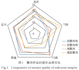 图1为4类蟹肉样品的感官品质对比分析,由图可知,重组蟹肉在口感、色泽、质地、气味和总分方面均明显优于纯蟹肉,表明添加TG酶有利于提高纯蟹肉的感官品质,尤其可显著改良口感和质地。由于仿蟹肉块和仿蟹肉棒均属于仿蟹肉制品,且以低值的海水鱼或淡水鱼为主要原料,佐以辅料加工而成,因此缺少蟹肉的固有风味,又因其含较多添加剂,例如蛋白、食盐、糖、食用色素、多聚磷酸盐等,所以,仿蟹肉制品的色泽、口感、质地得分及总分较高。
