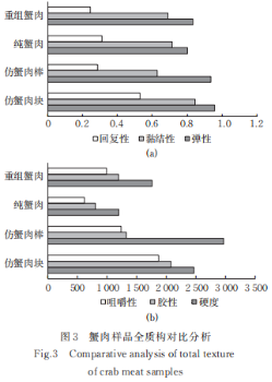 在水产制品加工中,全质构分析是品质评价的重要依据之一。由图 3 可知,重组蟹肉和纯蟹肉的硬度、弹性、胶性及咀嚼性的值均明显低于仿蟹肉制品,但是相较于纯蟹肉,添加 TG 酶的重组蟹肉的各质构参数值显著提高,说明 TG 酶的添加可明显改善纯蟹肉的各质构特性。