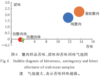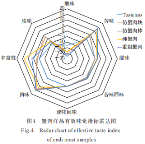 由图6可知,纯蟹肉和重组蟹肉的苦味、涩味和苦味回味均明显强于仿蟹肉制品,仿蟹肉制品的苦味低于4,苦味回味较小。可见纯蟹肉的味道更复杂多样。