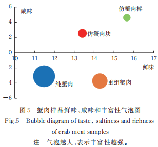 由图 5 可知,在 4 类蟹肉样品中,纯蟹肉的鲜味和咸味最低、丰富性最强,可见纯蟹肉在入口时鲜味和咸味并不强,但鲜味的持久度十足。重组蟹肉的咸味同纯蟹肉,鲜味有所增加,但丰富性明显不及纯蟹肉。仿蟹肉制品具有较强的鲜味和咸味,但丰富性较弱,其中仿蟹肉棒的鲜味和咸味最强。