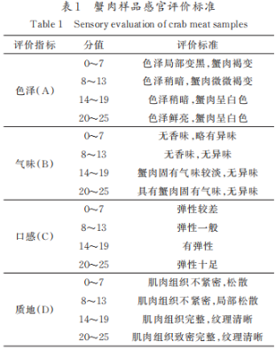 由 12 名感官评价专业人员组成评定小组,对 4 类蟹肉样品的色泽、气味、口感和质地进行评分,具体评价标准如表 1 所示。然后,计算总分:Y=An×15%+Bn×25%+Cn×35%+Dn×25%,其中,Y 表示蟹肉样品感官评价总分;An,Bn,Cn,Dn分别表示色泽、气味、口感、质地的得分。