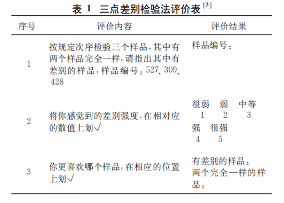 有46个鉴评员对三个编码样品‚按表1进行三点差别检验‚并填写评价表‚对收回的46张有效评价表进行了统计分析‚结果如下: