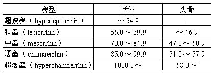 活体的和头骨的鼻型分类标准不同之处,主要是鼻宽的测点在两者有很大区别。结果,头骨上的鼻宽较之活体的鼻宽要小得多。另外鼻型分类尚有不根据测量方法,而是根据观察的方法来进行的。