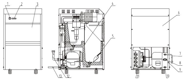 3.制冰碎冰机不用时,应排掉内胆内的余水,用干净的布擦干储冰箱内胆,拧掉箱体后面排污接头盖9,以排掉水盒内的余水,再拧紧排污接头盖9。