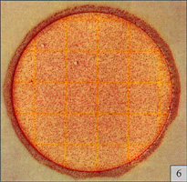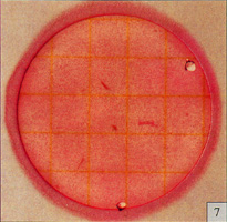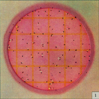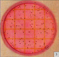 Estimated total coliform count=220 测试片面积约为20cm2,当菌落数超过150个,为了估计菌落数可选择其中一个或数个有代表性菌落的小方格(1cm2)计算平均菌落数,在乘以20方向得到整个测试片上的菌落数. 菌落太多时需进一步稀释样品,方能获得准确计数. |
