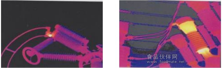 2、断路器内部触头或连接杆主要的发热故障是由于接触电阻过大而引起的。造成内部触头接触电阻过大的主要原因有:触头表面氧化;触头间残存有机杂物或多次分合后残存碳化物;触头磨损和烧蚀造成触头有效接触面积减少;触头弹簧断裂、老化或机械卡涩造成触头压力不足;引线接线板螺栓松动;软连接部分缺陷等。在这种情况下,发生故障的断路器的整体温度一般较其他正常的两相高,支柱瓷套的上下法兰有明显发热现象(如上图所示)。