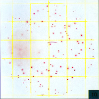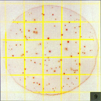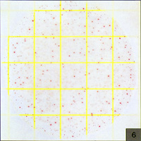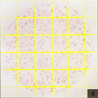 Count=560测试片面积约为20cm2,当菌落数超过250个,如图5所示,为了估计菌落数,可选择其中一个或数个有代表性菌落的小方格(1cm2),计算平均菌落数,再乘以20可得到整个测试片上的菌落数 |