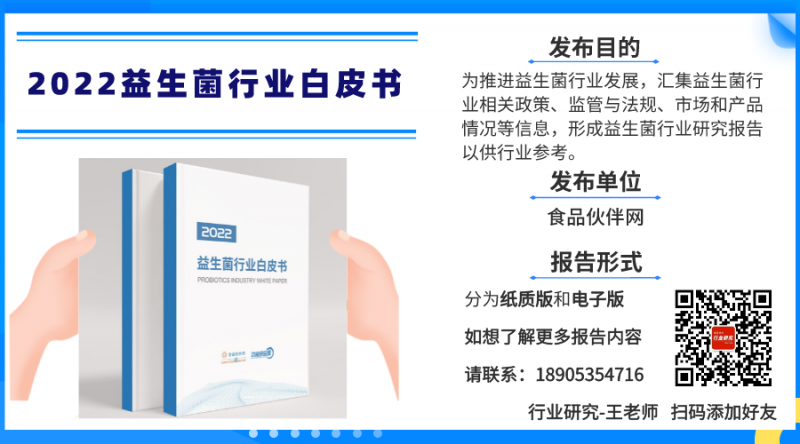 2022年12月27日,在食品伙伴网联合美中健康产品协会(HPA)和国际益生菌协会(IPA)举办的2022年益生菌在线峰会上,发布了行业研究报告《2022益生菌行业白皮书》。报告围绕益生菌行业概述、监管政策、发展情况、产品情况、线上市场情况、重点企业情况和发展趋势分析7个方面进行阐述。