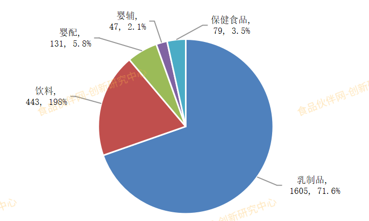 在调研的含微生物菌种产品的样本中,乳制品的产品数量最多,达1605个产品,占调研样本整体的71.6%;如下图所示。