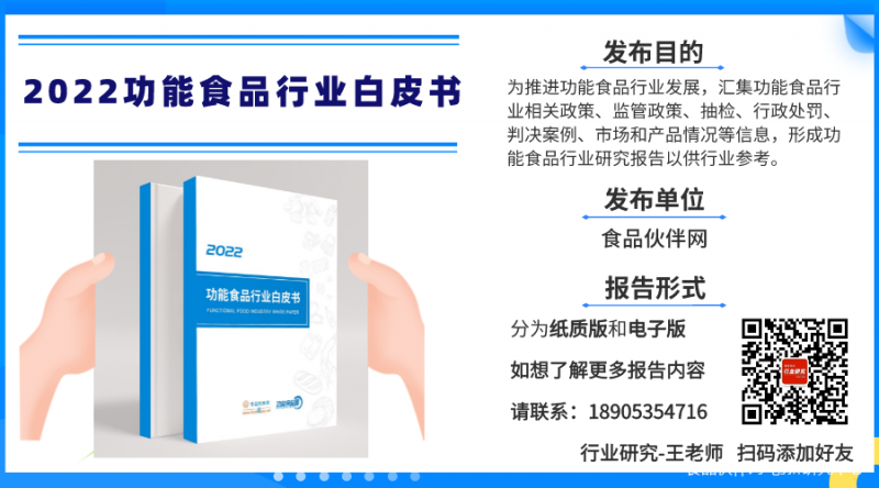 2022年12月27日,在食品伙伴网联合美中健康产品协会(HPA)和国际益生菌协会(IPA)举办的2022年益生菌在线峰会上,发布了行业研究报告《2022功能食品行业白皮书》。报告围绕功能食品行业概述、监管政策、抽检、行政处罚、判决案例、原料、产品情况、线上市场情况和发展趋势分析9个方面进行阐述。