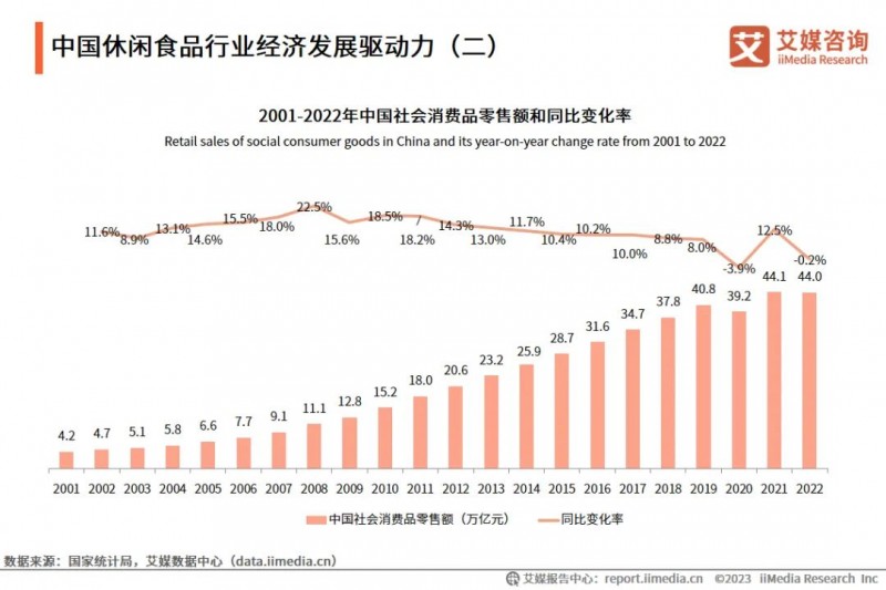 图表2 2001-2022年中国社会消费品零售额和其同比变化率