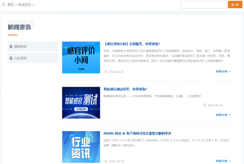 “感知网”官方网站共分为九大板块,涵盖新闻资讯、感官标准、技术资料、感官工具、培训会议、技术服务、仪器设备采购、感官评价员招募等内容,界面简洁有序,重点突出,全方面、多角度展现食品行业专业的感官评价应用服务商。